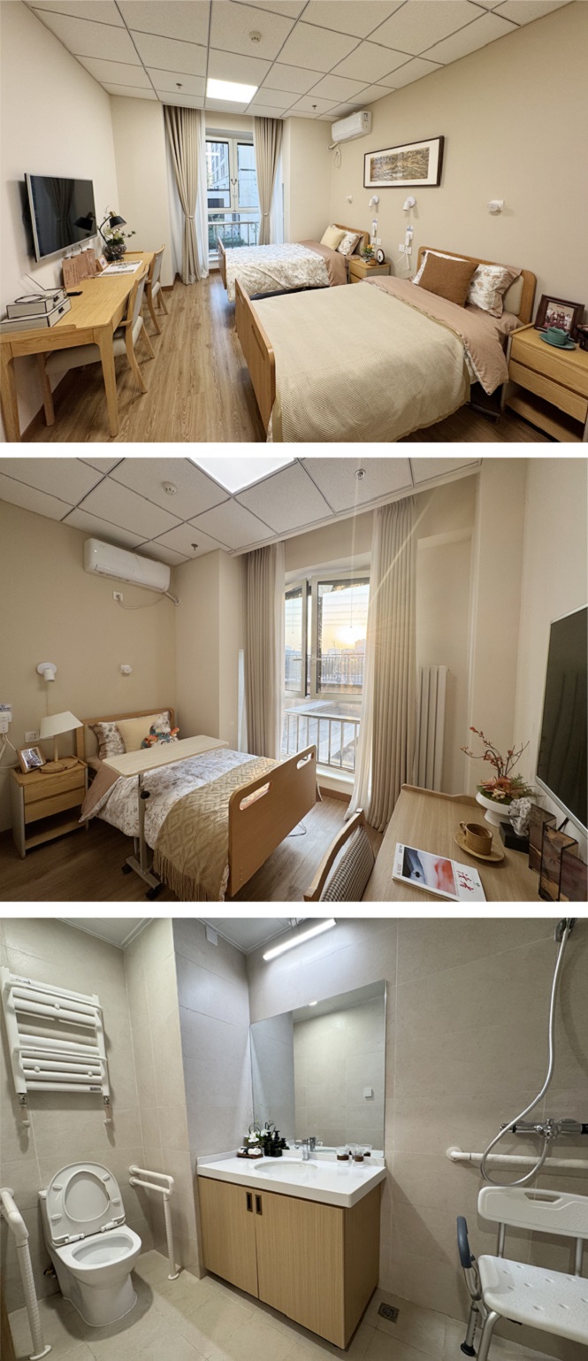 采用适老化设计:防滑地胶、扶手家具、无锐角器具全覆盖,搭配防眩光照明、卧室起夜灯等智能配置;内庭院分设“国医养生区”(中草药种植、按摩步道)与“代际互动区(儿童游乐空间),兼顾健康与情感需求。 分层设置护理站、助浴间、楼层餐厅,针对认知症长者打造“记忆互动长廊“五感花园” 缓解症状并激发自主活动能力。 医养方面距离机构约200米直达社区卫生服务中心,3.5公里内覆盖首都医科大学附属北京友谊医院(三甲)、北京安贞医院通州院区(心血管特色)等多家医保定点医疗机构,医养融合更安心。